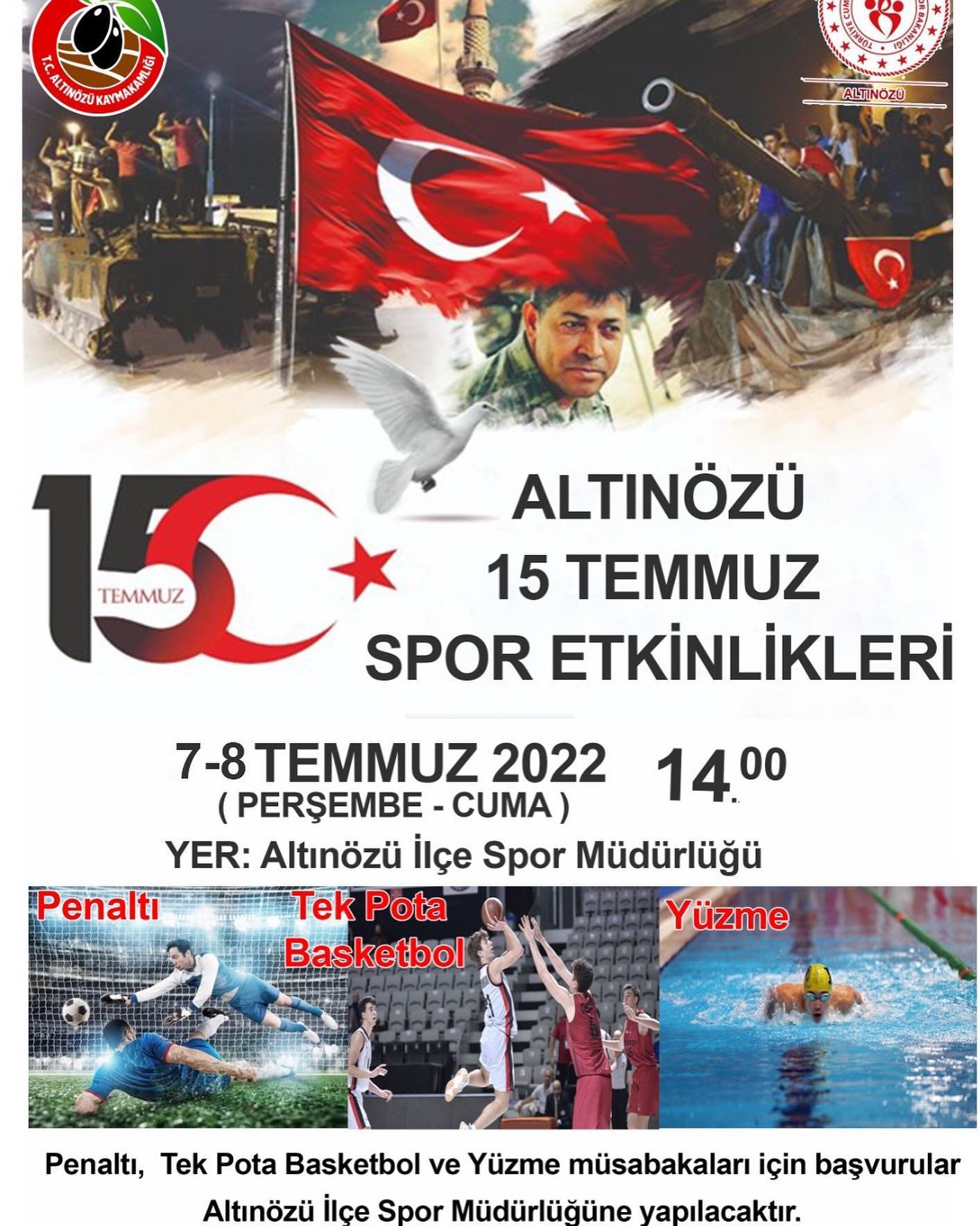 15 Temmuz Demokrasi ve Milli Birlik Günü kapsamında Altınözü ilçesinde çeşitli alanlarda sportif yarışmalar düzenlenecek. Altınözü İlçe Gençlik ve Spor Hizmetleri Müdürlüğü’nde yüzme, tek pota basketbol ve penaltı dallarında gerçekleştirilecek olan yarışmalar 7-8 Temmuz tarihleri arasında yapılacak. Altınözü İlçe Gençlik ve Spor Hizmetleri Müdür Ahmet Zümre, konuyla ilgili yaptığı açıklamada “Ödüllü yarışmalarımıza 7’den 70’e herkes katılabilir. Yarışmalarımıza tüm halkımız davetlidir. Ödüller 15 Temmuz gecesi tören alanında verilecektir” ifadesini kullandı. Müdür Zümre, yüzme, tek pota basketbol ve penaltı yarışmaları için başvuruların Altınözü İlçe Gençlik ve Spor Hizmetleri Müdürlüğü’nde alınacağını da sözlerine ekledi.