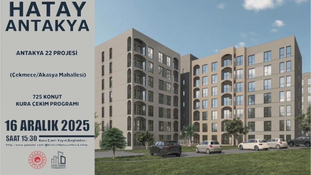 Antakya ilçesinde hayata geçirilen Antakya 22 Projesi kapsamında inşa edilen 725 konut için kura çekimi, 16 Aralık 2025 Salı günü noter huzurunda gerçekleştirilecek.