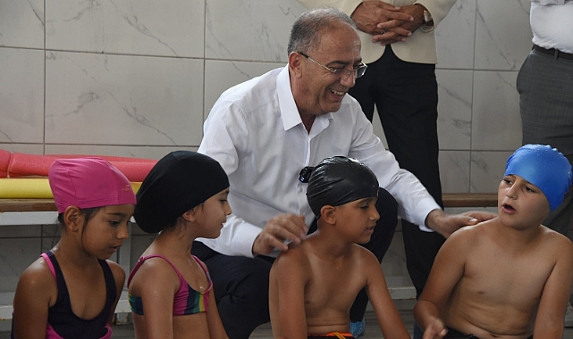 Antakya Belediye Başkanı İbrahim Naci Yapar, Antakya Belediyesi Sümeyye Boyacı Yüzme Havuzu’nda 6-12 yaş arasındaki çocuklara ‘Temel Yüzme Eğitimi’ kapsamında verilen yüzme ders kursunu ziyaret ederek çocuklarla bir süre sohbet etti.
