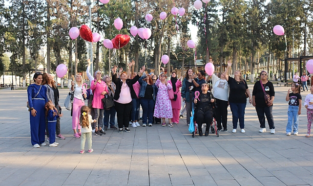 Paylaşım üzerine İskenderun Ziraat Parkı'nda toplananlar, meme kanserine dikkati çekmek için "Kanser değil, biz güçlüyüz" sloganlarıyla pembe balonları gökyüzüne bıraktı.