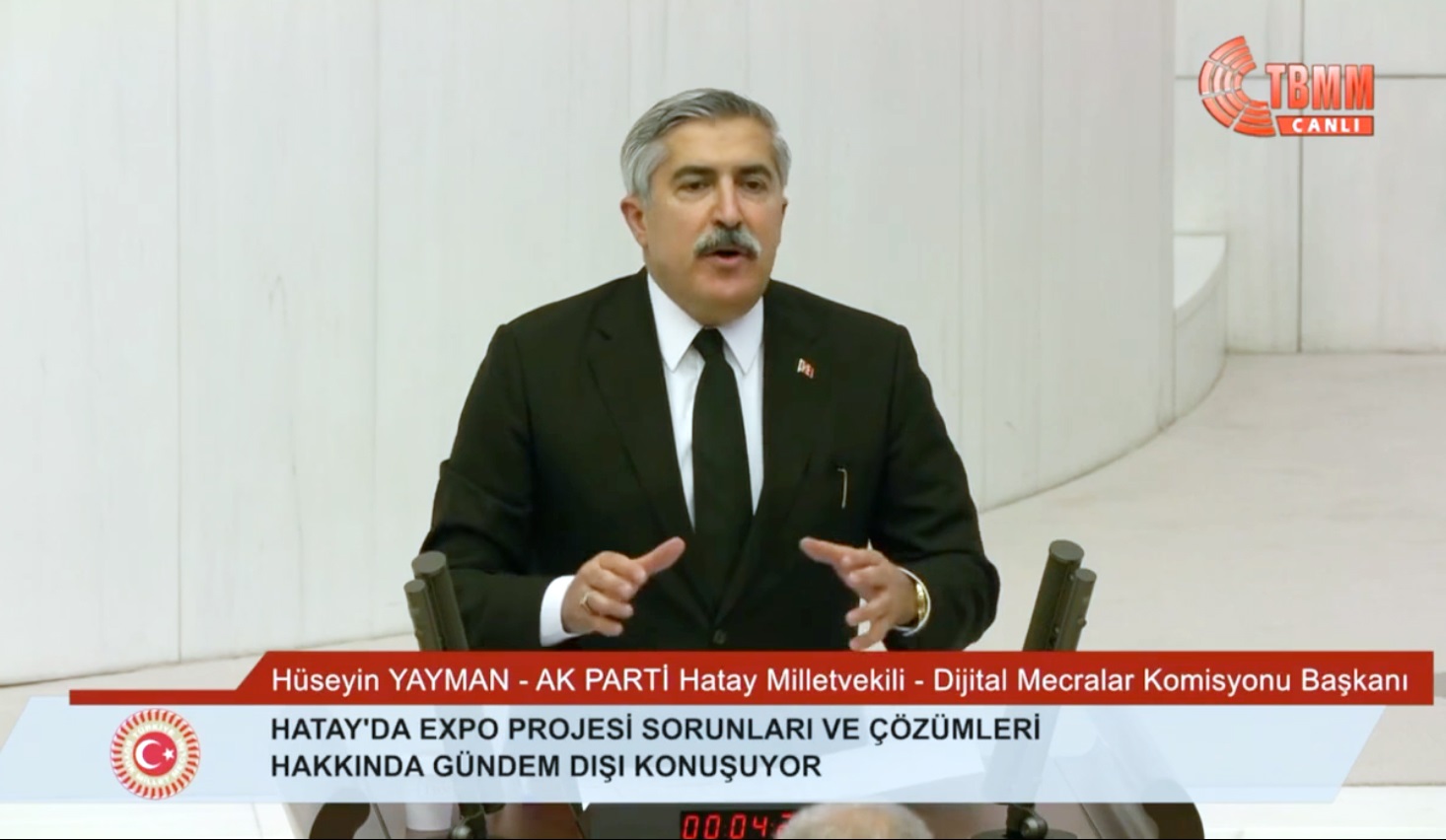 TBMM'de söz alan ve EXPO ile ilgili sorunları ve çözümleri hakkında gündem dışı konuşma yapan Yayman, 2017 yılında anlaşma imzalandığında o günden bu güne verilen sözlerin hiçbirinin tutulmadığını belirterek "Hatay, barışın ve kardeşliğin başkentidir; Hatay, Türkiye’nin açık hava müzesidir; Hatay, dillerin, dinlerin, medeniyetlerin beşiğidir; Hatay, hikâyesi olan şehrimizdir. Bu bağlamda, bu girişle şunu altını çizerek belirtmek isteriz: Biz, Hatay’da taş üstüne taş koyan herkese sonsuz teşekkür ediyoruz;