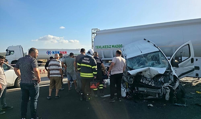 Hatay'da tankerle çarpışan hafif ticari araçtaki 3 kişi yaralandı.