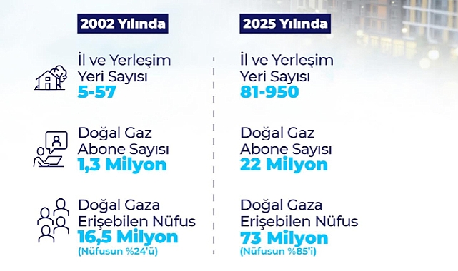 Bakan Bayraktar, 2002 yılında sadece 5 ilde sunulan doğal gazın, bugün 81 ilin tamamına, 950 yerleşim yerine ve 22 milyon aboneye ulaştığını belirtti.